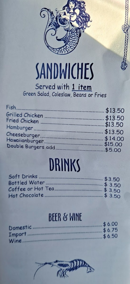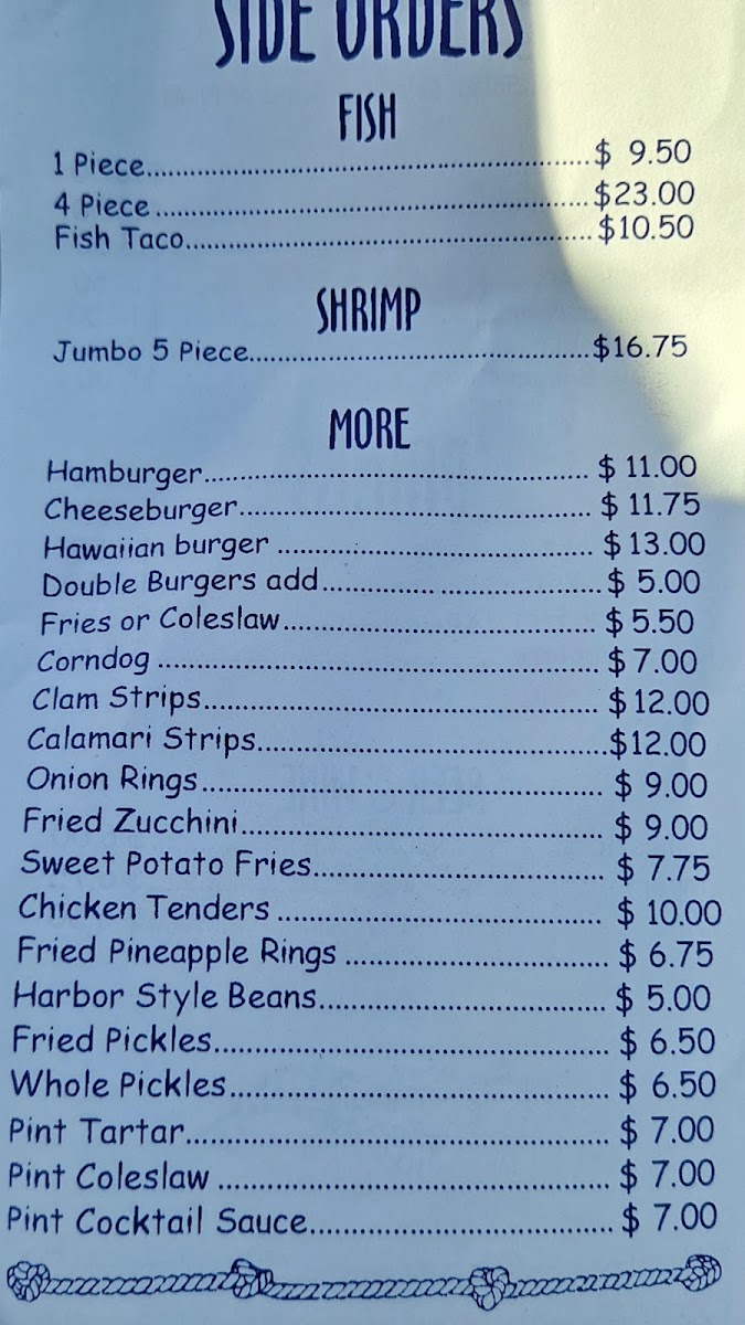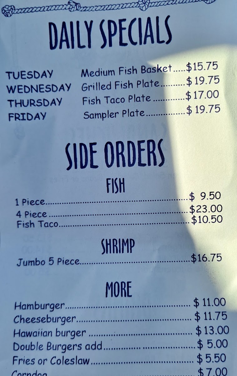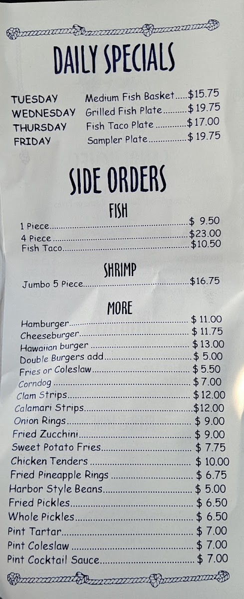 From the moment you step inside, the inviting vibe and friendly staff make you feel right at home. This establishment prides itself on freshness, cooking everything to order. Guests rave about the fish, particularly the Alaskan cod, showcased in a variety of options. Among the highlights from the menu is "The Captain's Special," featuring two pieces of fish paired with two succulent shrimp for just $16.75. If you're looking for variety, the "Sampler" plate includes a perfect balance of one piece of fish, two shrimp, crispy fries, coleslaw, and a cup of clam chowder for $17.00—an indulgent feast that will satisfy even the heartiest of appetites.